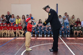 Участь дітей дошкільного віку у мілітаризованому дійстві у воєнній формі.